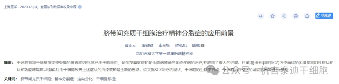 2020年,昆明医科大学第一附属医院精神科在中国知网发表了一篇有关脐带间充质干细胞治疗精神分裂症的应用前景的论文综述,该综述表明目前,精神分裂症(SCZ)治疗面临的困境是其阴性症状和认知功能障碍难以缓解,利用干细胞改善上述症状的治疗策略是全新的思路。