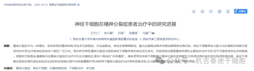 同年,西安交通大学环境与疾病相关基因教育部重点实验室在中国知网发表一篇关于神经干细胞在精神分裂症患者治疗中的研究进展。综述表明神经干细胞在胚胎发育和神经系统发生损伤时的修复过程中发挥着重要作用,将其用于精神分裂症的治疗具有显著优势,这为精神分裂症的治疗提供了新的思路。