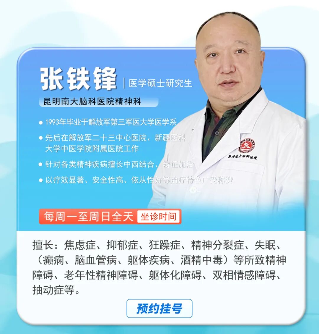 我是精神科门诊主任张铁锋,致力于焦虑症、抑郁症、躁狂症、精神分裂症、难治性睡眠障碍、(癫痫、脑血管病、躯体疾病、酒精中毒)等所致精神障碍、老年性精神障碍、躯体化障碍、双相情感障碍、抽动症、青少年情绪行为障碍等健康科普知识分享。