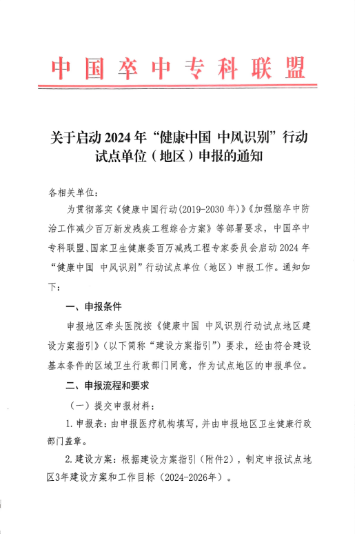 2024年3月,在国家百万减残专委会指导下,中国卒中专科联盟组织专家结合首批试点单位的工作经验,修订发布了2024年《健康中国 中风识别行动试点地区建设方案指引》,为“行动”的规范开展提供了明确指引。同期启动了2024年度“行动”试点区申报工作,截至4月30号,秘书处累计收到200余家单位申报材料,其中获得地方行政部门支持并盖章的有164家,120家提交了试点区建设方案。