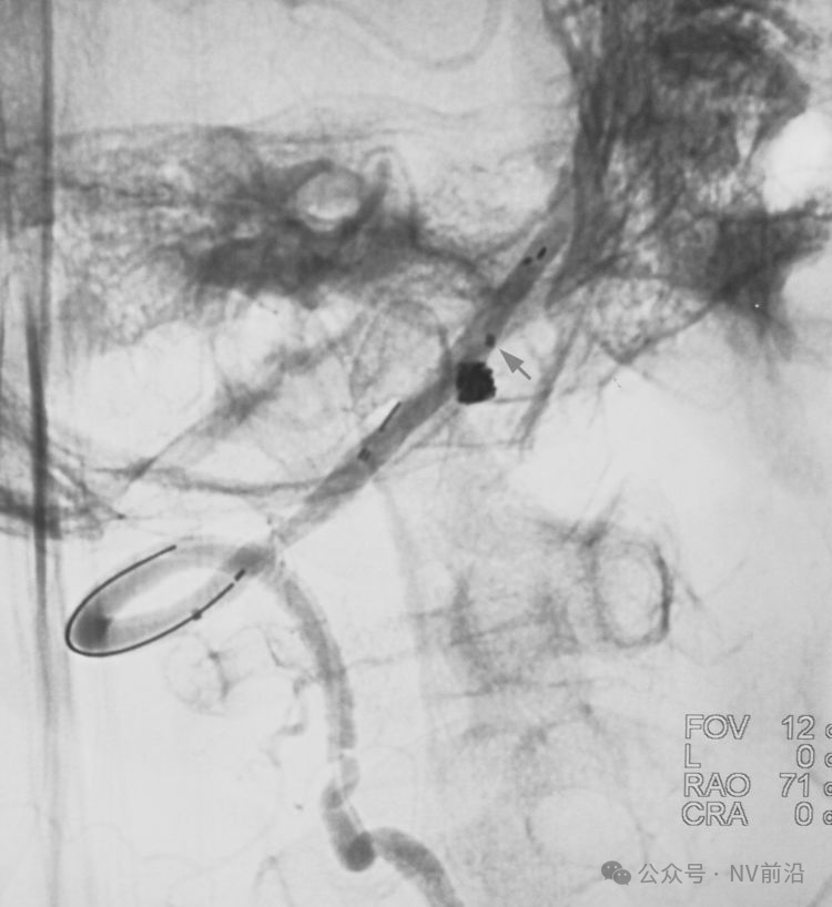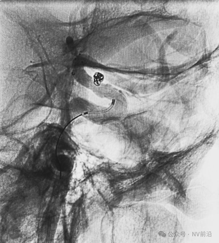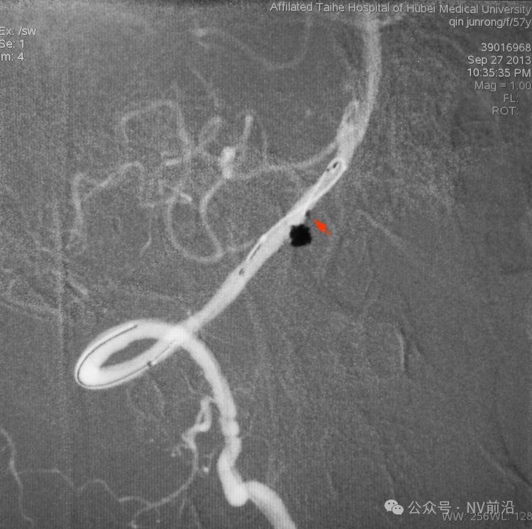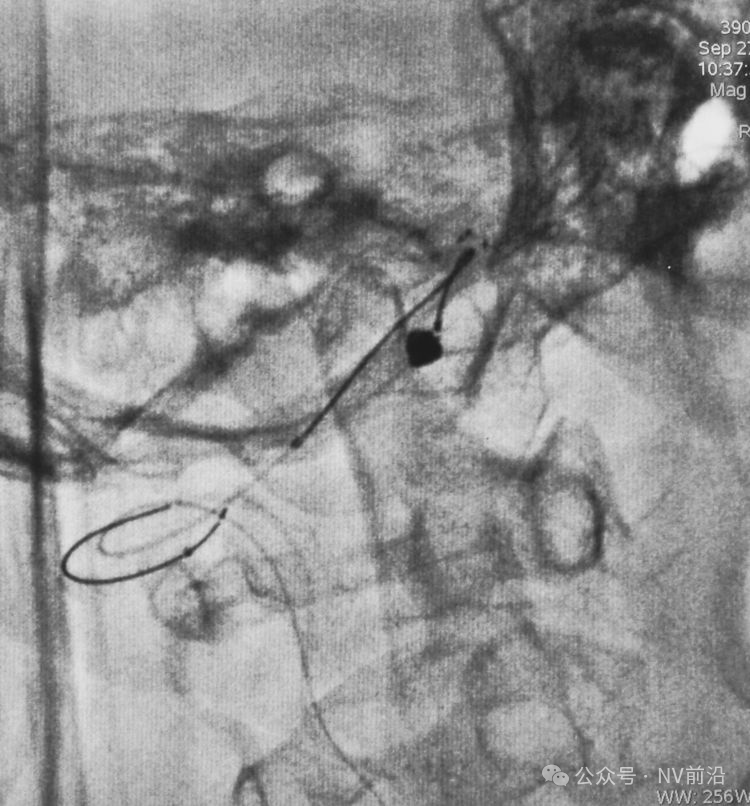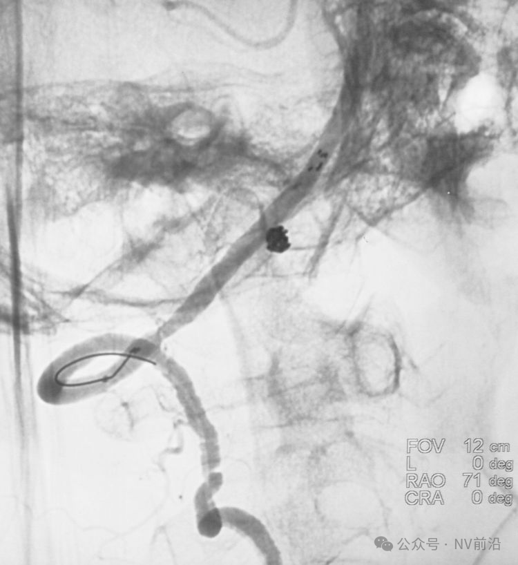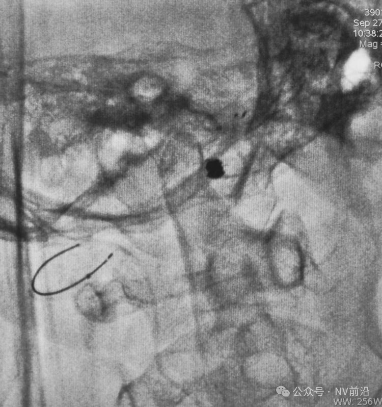 结束栓塞后不要直接撤管,要先把微导管往远心端送,使管头脱离瘤腔,再缓慢回撤。