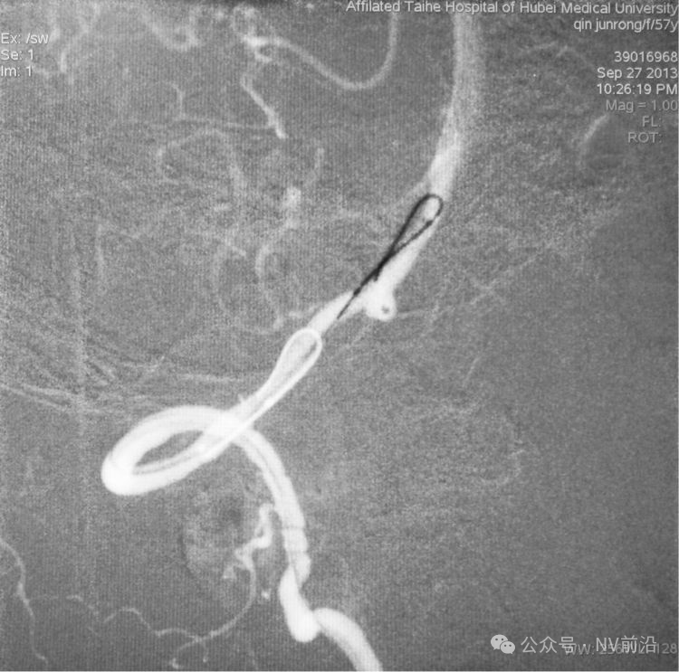 依次送入QC-2-4-3D,2-3-Helix,1.5-2-Helix,1.5-2-Helix四枚弹簧圈,最后一枚弹簧圈将管头(箭头)顶出瘤腔。