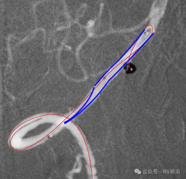跨瘤颈释放Solitaire 4×20支架(蓝线),压住微导管(红线),在支架保护下经返折的微导管送入弹簧圈填塞瘤腔。