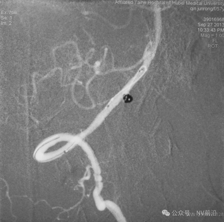 微导管撤出后,完全释放Solitaire支架,可见突入载瘤动脉的弹簧圈被压回瘤腔。