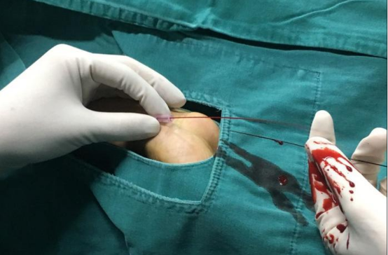 一般来说慢慢回退穿刺外套时会像下图一样,血流是喷出的,多数情况下这时是可以顺利滑入导丝的。但是也会有导丝不能顺利滑入的,这时可能是针芯外套头端贴在血管壁上,可以慢慢旋转或者适当回退,亦或轻压穿刺口来调整针芯外套头的位置,后尝试慢慢进入导丝,导丝尝试进入时一定轻柔,倘若还是不行,左手固定穿刺外套,需要再次插入穿刺针芯,重新进入透壁桡动脉,若仍反复不行的话,就需要彻底拔出后重新穿刺了,可以更换穿刺点,一般穿刺点向近心端移动。
