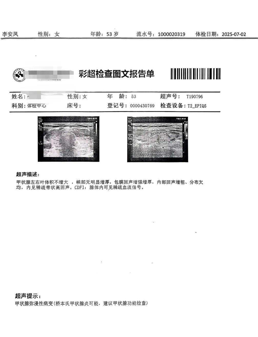 B超:甲状腺像“被虫子蛀过的木头”,回声不均匀,这是慢性炎症的典型表现。