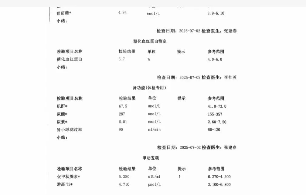 TSH偏高(5.38,正常<4.2),但游离T3/T4正常,属于“亚临床甲减”(像汽车油快见底但还能开)。