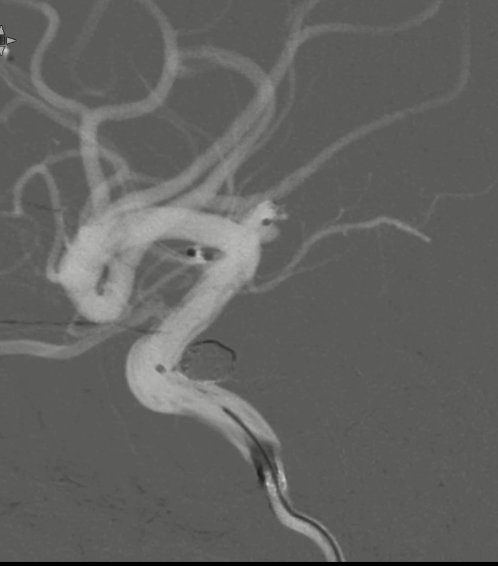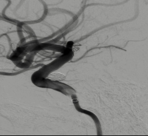 Title: Stent-assisted coil embolization of a small wide-neck aneurysm in the right anterior cerebral artery A1 segment.