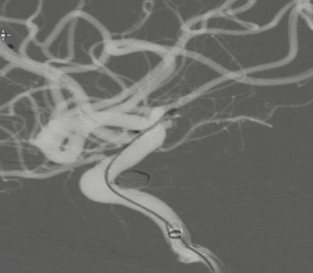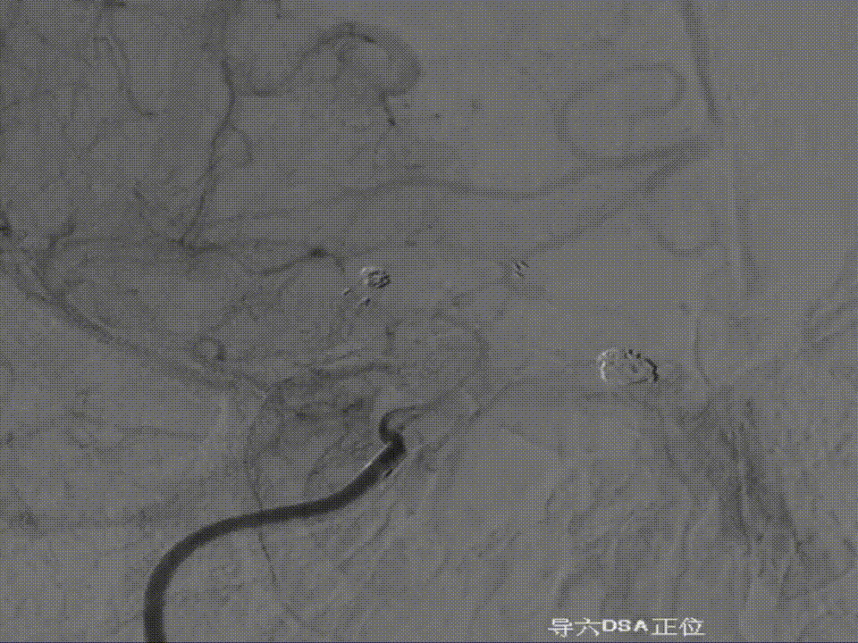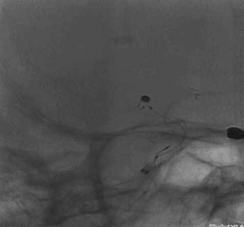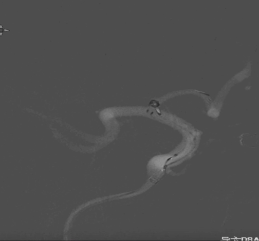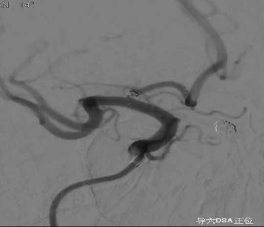 继续填入Target 1.5/2弹簧圈成篮,后完全释放支架,其近端位于颈内动脉分叉处,远端位于A1远端。
