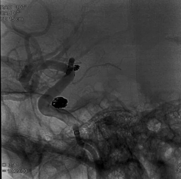 通过璞慧0.017微导管填入Target 1.5/2弹簧圈部分成篮,后释放Atlas 3.0/15支架覆盖瘤颈处,继续填入弹簧圈时微导管脱出,尝试用弹簧圈将微导管引导超选瘤腔失败。