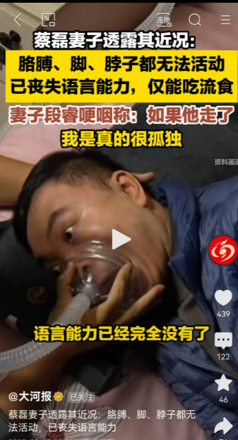 妻子段睿透露蔡磊近况,称他已经完全没有语言能力了,胳膊、脚、脖子都无法活动,目前仅能吃一点流食。“如果他走了,我会真的很孤独”。