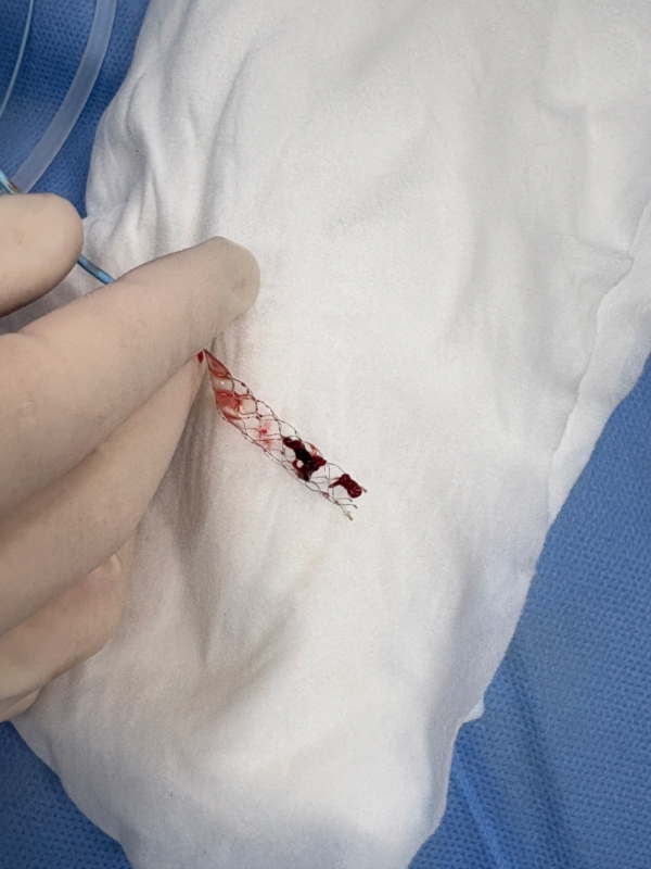 “患者太年轻了,必须拼尽全力!”卒中中心团队傅新民主任、陈施吾医生、张慧医师迅速启动急诊取栓绿色通道。手术台上,医生凭借精湛的介入技巧,小心翼翼地操控导管,穿过纤细的椎动脉,精准抵达闭塞的基底动脉部位。随着器械缓缓推进,一团血栓被成功取出,原本堵塞的血管重新恢复通畅。