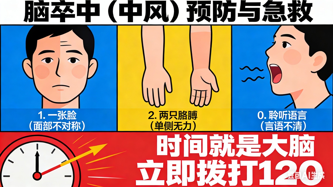 除了明确急救方式,掌握脑卒中早期识别方法也至关重要,临床常用120口诀,简单好记、实用性强:1看(一张脸),观察面部是否对称、口角有无歪斜;2查(两只胳膊),双手平举,观察是否有单侧无力、下垂;0听(聆听语言),听患者说话是否清晰、有无口齿不清或无法说话。只要出现其中任意一项,就需立即拨打120,切勿拖延。