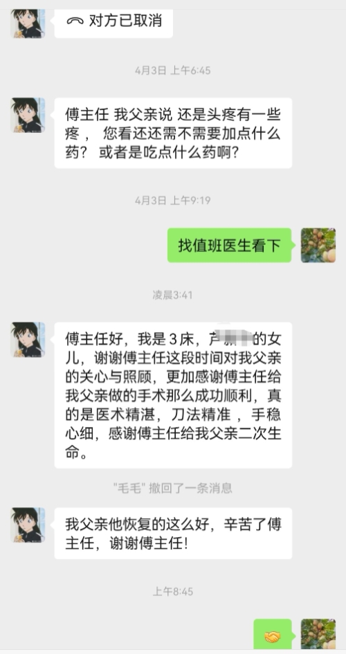 “傅主任好,我是3床芦**的女儿,谢谢傅主任这段时间对我父亲的关心与照顾,更加感谢傅主任给我父亲做的手术那么成功顺利,真的是医术精湛,刀法精准,手稳心细,感谢傅主任给我父亲二次生命。我父亲他恢复的这么好,辛苦了傅主任,谢谢傅主任!”