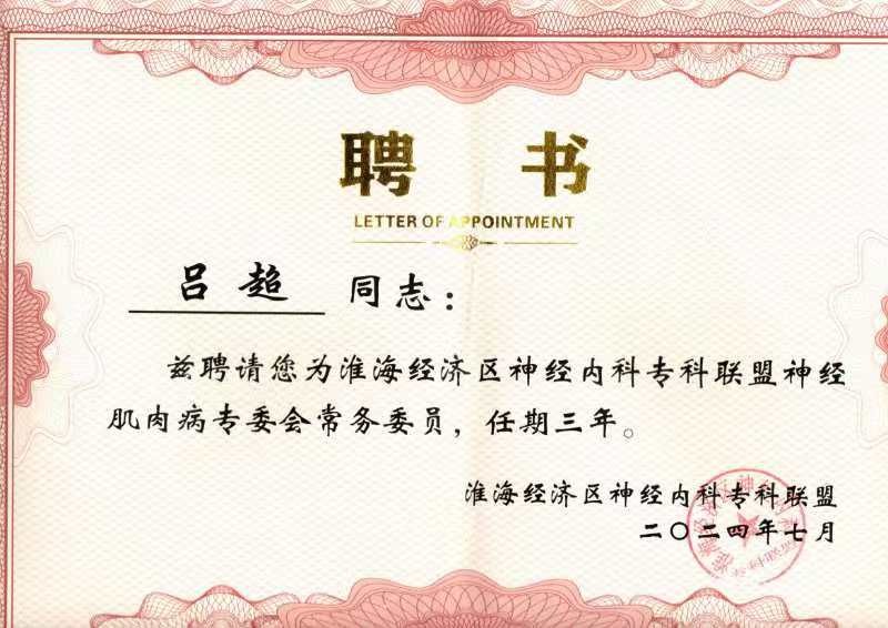 中国老年保健协会智慧医养专委会委员,北京神经内科学会全科医学专委会委员,北京神经科学学会神经免疫与相关疾病专业委员会委员,徐州市介入神经病学研究会神经心理专业委员会副主任委员,中华病例说 案例推荐官,中华医学会会员,江苏省卒中学会会员,淮海经济区神经内科专科联盟脑卒中专委会委员,神经重症专委会委员,认知障碍专委会委员,徐州市卒中学会急救专委会委员等
