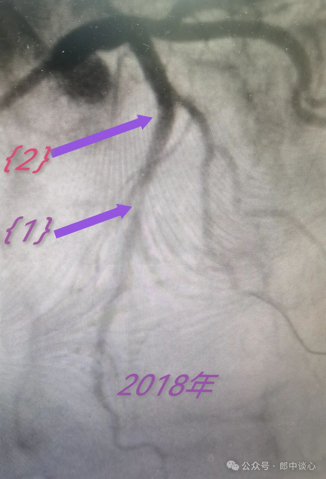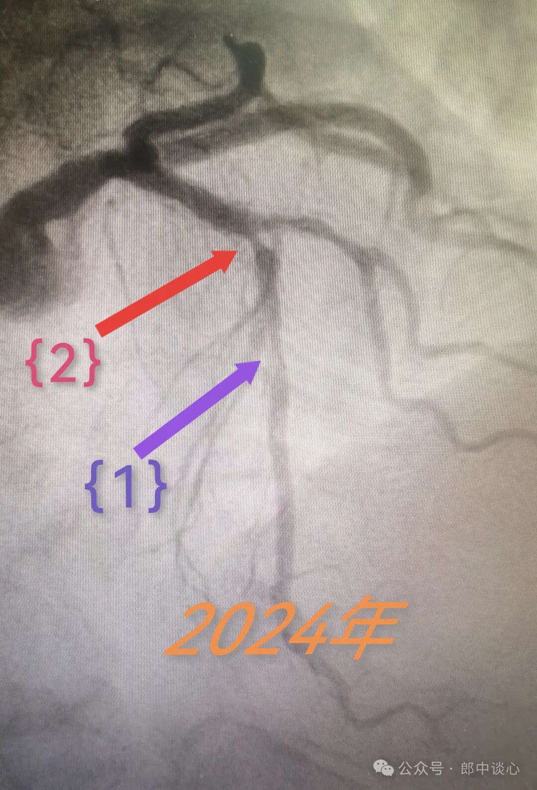 粗大的对角支有个严重的狭窄(小箭头所示),前降支主支有个临界病变{1},而{2}部位造影上当时看着很正常。