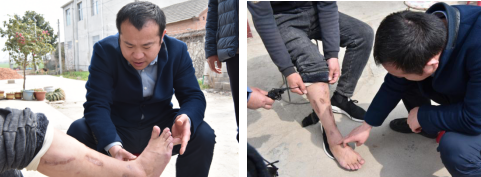 这次家访的时候,赵大叔通过锻炼已经具备了踝关节正常跖曲和背伸的功能,曹广超主任通过查体发现小腿肌肉力量仍有不足,后续还要通过锻炼来加强小腿肌肉的力量。