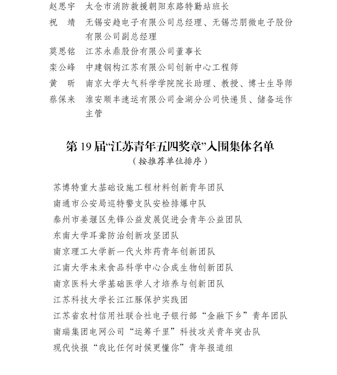 今年1月,共青团江苏省委、江苏省青年联合会启动开展第19届“江苏青年五四奖章”评选,经资格审核、专家送审、现场答辩等环节,并经团省委书记办公会研究审定,现对入围个人(集体)名单予以公示。
