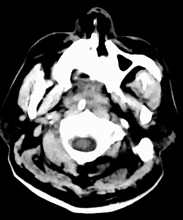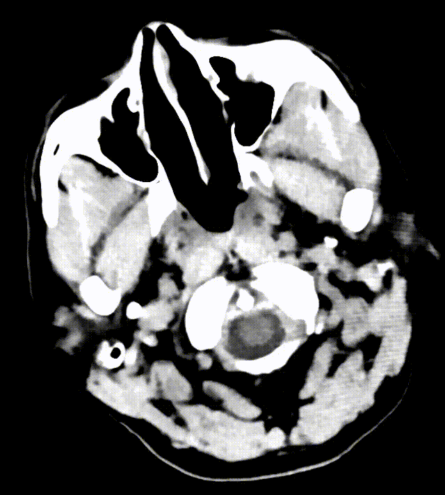专科查体:嗜睡状态,唤醒能遵嘱。双侧瞳孔等大等圆,直径约3.0mm,光反射灵敏,双眼可见水平眼震。双侧额纹对称,左侧鼻唇沟变浅,伸舌稍偏右。四肢肌力5-级,四肢肌张力基本正常,肢体感觉存在对称,双侧腱反射(+++),共济检查合作,双侧Babinski阳性,无脑膜刺激征。