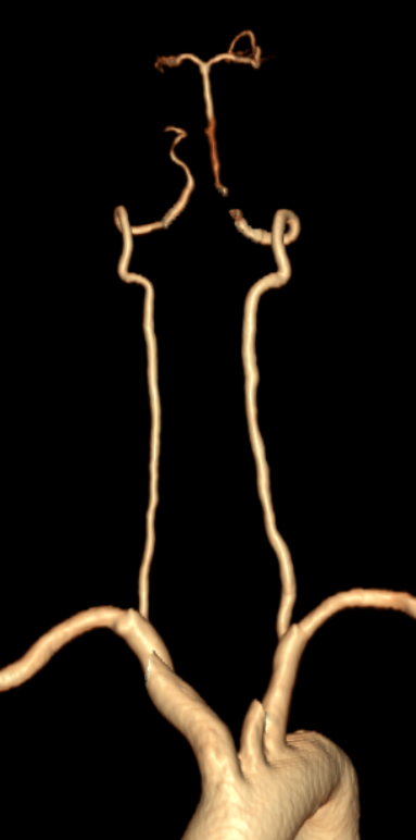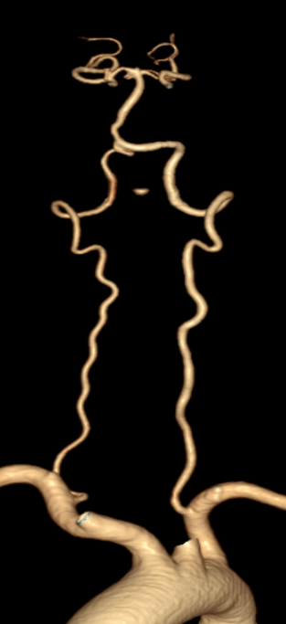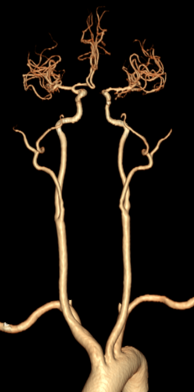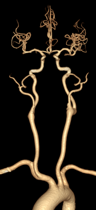 双侧颈总动脉、颈内外动脉及颅底动脉环(Willis环)显示良好,双侧颈内动脉颅内段、双侧大脑前、中、后动脉及分支血管通畅,血管形态、走行规则,管腔通畅,管壁光整,管腔未见明显异常瘤样扩张、狭窄或闭塞。