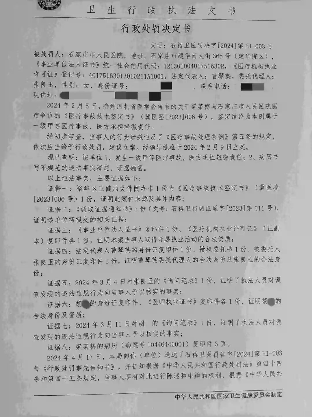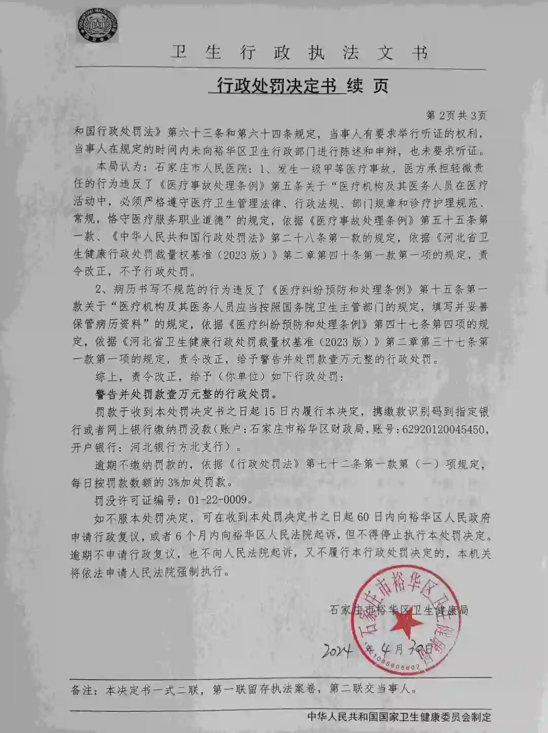5月5日,石家庄市裕华区行政执法公示发布对“石家庄市人民医院行政处罚决定书”,详情如下:2024 年 2 月 5 日,河北省医学会转来的关于梁某梅与石家庄市人民医院医疗争议的《医疗事故技术鉴定书》(冀医鉴 [2023]006 号),鉴定结论为本例属于一级甲等医疗事故,医方承担轻微责任。经初步审查,当事人的行为涉嫌违反了《医疗事故处理条例》第五条的规定,依法应当给予行政处罚,建议立案。已于 2024 年 2 月 9 日立案。最终,予以石家庄市人民医院警告并处罚款壹万元整的行政处罚。看到没有,虽然医方事实责任轻微,但为什么还要行政处罚?一方面是医疗机构管理的不规范,另一方面也反映出医护人员法律风险意识的淡薄。病历书写,应当客观、真实、准确、及时、完整、规范。去年,南昌一家医院,14名医护人员被依法警告罚款。处罚原因就是病历书写不规范。在2020年10月至2022年12月两年期间,医师、护士在住院患者病历中代签其他医生、护士名字;医师未按照规定向患者的监护人告知治疗方案和治疗方法并取得其书面同意。2020 年,河南某三级医院的神经外科主任宋医生没有在手术知情同意书上签名,也没有在术后 24 小时内给手术记录签名。患者出院 4 个月后,复印病历时发现缺少签名,投诉到郑州市卫健委。郑州市卫健委对宋医生处以 15000 元罚款。宋医生不服,认为处罚过重,将郑州市卫健委告到法院。法院判决维持郑州市卫健委的行政处罚。理由是:医生不好好写病历,此风不可涨!唐山市卫健委也曾因病历签名不规范问题,对辖区两家医院分别处以 35000 元和 50000 元的行政罚款。不仅仅是行政执法这一块,一旦打起医疗纠纷官司,更是处于挨打被动。根据《侵权责任法》、《病历书写基本规范》、《执业医师法》这三部法律法规相关规定,病历不规范,有可能从而被推定存在过错的民事法律风险,会使医方在医疗纠纷的审判中,处于不利地位。曾经有一个医疗纠纷判例,一位肠癌晚期的患者突发心跳骤停,医生下达口头抢救医嘱,患者抢救死亡后由实习生代写病历并代签名,结果患方发现,认为医生病历是实习生代为书写并签名,于是对于病历及诊疗行为存疑,从而拒绝进行医疗损害鉴定,法院最终判决医院对此承担相应的责任。最近有个根据真实事件改编的电影《三大队》,张译,李晨演的。这部电影有一个主题,就是规范,比什么都重要。张译的师父,一个老警官,因为追捕疑犯二勇,脑溢血成了植物人。就因为他回家喝了半杯酒,就没有给他算工伤,只能以同事们募捐的方式贴补他的医疗费。写病历,是每个医生踏入临床的必修课,更是医疗质量管理规矩要求。然而,必须正视的是,一份细致完善的病历和临床医生有限的精力之间,存在天然的矛盾。大病历、首程、主治查房、主任查房……重复的病历书写,把医生似乎变成了机械化生产的流水工人。所以,对照模板黏贴复制,自然就是工作量饱和下的无奈之举。但是,从复制粘贴病历的医生,到流于形式的病历把关审核,为此承担风险的,不仅是患者,也是医生。每年因病历书写和质控问题导致的医疗纠纷和法律问题层出不穷。如何平衡病历书写质量和医生工作量之间的矛盾,应该是中外医疗机构必须都要努力探讨的课题。为了给医生的病历书写减负,美国专门实行病历抄写员制度。抄写员受过医疗信息管理的培训,协助医生实时记录病历,帮忙医生收集检验结果并与转诊医生沟通。为医生,节省了大量的时间。不是说医护犯错了不要惩罚,所有的犯错都必须有人买单。更何况是医护行业,健康所系,性命相托。处理责任人我觉得没有问题,但是要从根源上去找问题,现在大部分医院临床医护人员人手不足,是最大的问题!一个医院,1000+职工,临床医生约200人,护士不足300人,不到总职工人数的一半,累的累死,玩的玩死。每天加班加点,没有加班费,请个假都难,请假还要扣钱。逢年过节还要上班,生病了还要带病工作,还不能出错。开车都还有个强制休息,不许疲劳驾驶呢。有个医生说,他们科室床位68张,住院患者高峰期140人左右,加床挤得走廊就像难民营,医护加起来只有10个人。这种情况,病历怎么可能写得那么丝毫不差一字不错的绣花针落地?如果卖淫嫖娼案件多发,说明地方经济发达,如果抢劫盗窃案件多发,说明地方经济衰落。如果医护人员没有理由犯下不该犯的错误,的确不该,理应该罚。但是,如果不细查原因,追根溯源,找出犯错违规的促酶因素,缺乏对他们的关爱,只是一味地惩罚,不顾原因的追究后果,这不是亡羊补牢,而是将错就错。医疗质量18项核心安全管理,不单单是临床医护人员的事情,而是医院全方位综合性抓手的问题。总不能,明明是一个医院综合管理的问题,结果却成了,领导永远不会错,行政永远不会错,只有临床出错了,都是他们自己的问题。板子仅仅只是打在他们身上。