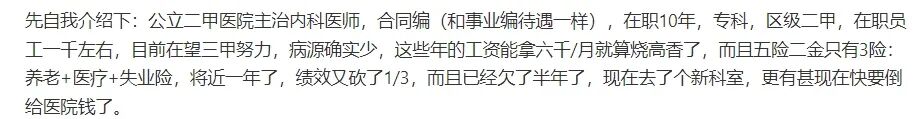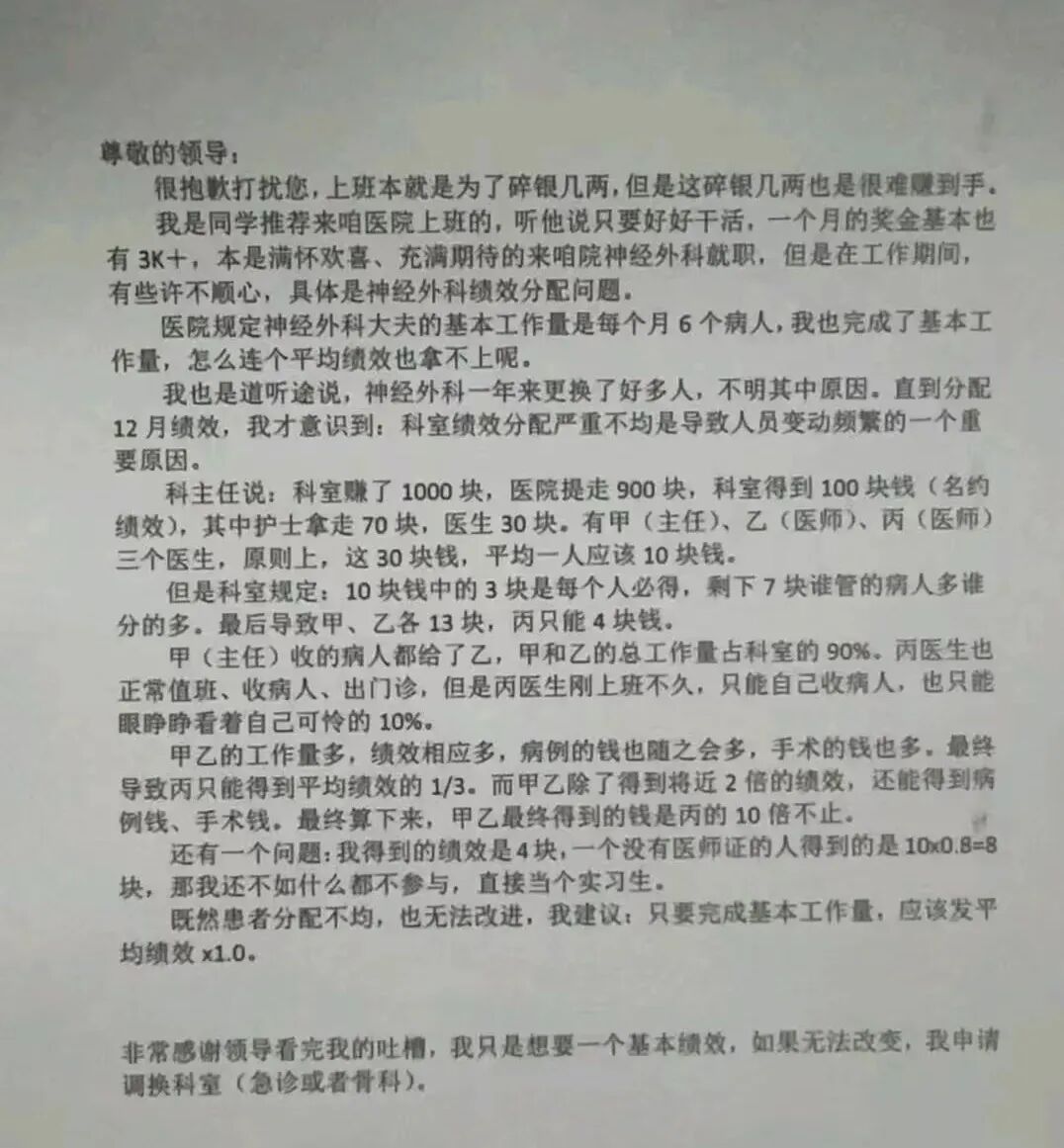 5月22日,河南的一位医生在网上分享了自己“-302.7元”的绩效工资表,惊呆众人!该博主表示:“公立二甲医院主治内科医师,合同编(和事业编待遇一样),在职10年,专科,区级二甲,在职员工一千左右,目前在望三甲努力,病源确实少,这些年的工资能拿六千/月就算烧高香了,而且近一年来五险二金只有3险(养老+医疗+失业险),如今绩效又砍了1/3,而且已经欠了半年了,现在去了个新科室,更有甚现在快要倒给医院钱了”。这位医生的基本工资一半为保底工资,另外一半按绩效发放!只是绩效按9:1分配,即医院占90%,科室占10%,加上病源本来就少,就更谈不上绩效收入了,能拿全工资就已经很好了!他自己分析了一下原因:“我们一月收入几百万,扣费几十万,出去开支医院营收-30%,加上新科室引进设备、器械、水电、耗材等,总之一切费用都是由科室内部承担,而且扣除的是绩效中可怜的那1/10,绩效就变成了负数了”。最令人无语的是,这名博主表示,医院建设新楼花费了大量财力,还欠供货商、器械商9位数以上的费用,此外,除了60%的医护需要“养活”以外,医院还有40%的后勤人员......他想要谋得出入更是进退两难:“我规培三年,出去进修一年,且合同未到期,如果离开估计需要赔偿十万左右,离开后公立医院也很难再进了,如果去私立医院待遇也只有一万左右,但却要背井离乡,和朋友创业更要抛家舍业,前途未卜......如果留下要么摆烂要么只能等待渺茫的机会才能更进一步”。河北的一位医生感同身受,他表示,在县医院搞重症,作为被动科室,如果医院的政策支持,科室病人会很少。如果医院的总体病人很少,那么这个科室病人会很少,收入很低的。且他所在的这家医院平时全院住院病人700左右,监护室病人才5-10。每月收入在临床科室中垫底,工资低还很累......新乡市市级二级公立医院的一位麻醉科医师也遇到了类似的问题:“我所在医院也是拖了半年工资没发,每个月还有4000块贷款要还,感觉也快撑不下去了。我目前是主治还不够硬气,如果去别的三级医院进副高可能会更难,我认识的很多医生都是进了副高再走,学医还不如进胖东来,我初中同学是新乡胖东来开业第一批元老级员工,当年上了个职专毕业就直接去了胖东来,现在一个月1w+,而且创始员工手里都给分了股份,每年还能拿股东分红......学医+从医数年却连这都比不了”。此前,一名医生给领导的一封信在网络上引起了热议,信中表示“我是同学推荐来咱医院上班的,听他说只要好好干活,一个月的奖金基本也有3K+,本是满怀欢喜、充满期待的来咱院神经外科就职,但是在工作期间,有些许不顺心,具体是神经外科绩效分配问题。”“医院规定神经外科大夫的基本工作量是每个月6个病人,我也完成了基本工作量,怎么连个平均绩效也拿不上呢?分配12月绩效,我才意识到,科室绩效分配严重不均是导致人员频繁离职的一个重要原因。”“科主任对我讲,科室赚了1000块,医院要提走900块,科室得到100块钱(名曰绩效),其中这100块,护士拿走70块,医生30块。科室有甲(主任)、乙(医师)、丙(医师)三个医生,原则上,这30块钱,平均一人应该10块钱。但是科室规定:10块钱中的3块是每个人必得,剩下7块谁管的病人多谁分的多。最后导致甲、乙各13块,丙只能4块钱。我得到的绩效是4块,而甲乙除了得到将近2倍的绩效外,还能得到病例钱、手术钱……既然患者分配不均,也无法改进,我建议:只要完成基本工作量,就应该发平均绩效x1.0,我只是想要一个基本绩效,如果无法改变,我申请调换科室(急诊或者骨科)。”这封信与河南那名医生博主的遭遇也很类似,同样是科室居然只能得到总绩效的10%,那剩下的90%分给谁?医院要怎么使用?患者来医院看病,医生接待患者,解除病患的同时创造收益,按照多劳多得的分配规则,无论从哪方面分析,都不该由医生分走那少得可怜的个位数占比。众所周知,由于医院是实行差额管理的事业单位,按理说当地财政应拨付40%的基本工资,但在2023年,大部分医院反映,实际仅拨付了20%-30%。到手的基本工资偏低现象在中西部较为普遍。例如,武汉某三甲医院急诊科主任介绍,她2023年下半年到手的基本工资仅为2100元,在这种情况下,医生的收入主要依靠绩效。大家都眼巴巴地等着分绩效呢,这个绩效是科室自己挣的,可怎么分?事实上,分配绩效主要看收支结余,其中的收入部分,是指科室收治病人获得的检查费、治疗费、床位费等;支出部分则包括科室人员成本、房屋及医疗设备折旧成本等,收入减去支出后结余的钱,是医院的总绩效。一般来说,医院要按10%-25%的提成给科室作为绩效,科室主任在科室绩效的基础上按职称及工作量分配给科室医生和护士。经过一番解释,这下你懂了?由于每个科室结余的钱不同,医院内部也没有转移支付这一说,以科室结余定绩效的方式较为普遍,所以,各个科室的绩效差别很大。医院的心内科、神内科、消化内科都属于绩效高的科室,在一些医院,神内主治医师的绩效收入甚至比绩效不好的科室医生高出1万多。上海一家三甲医院骨科主任医师曾表示,他所在医院的整形美容外科、辅助生殖科收入是较高的,甚至远高于肿瘤、器官移植等科室。开一个双眼皮1万-2万元,一位医生每天都做30-50个双眼皮,短平快且没有消耗,自然,他的绩效就会非常好;而抢救生命的一些科室,比如一个肝移植整个团队要忙一整天,虽然社会效益高,