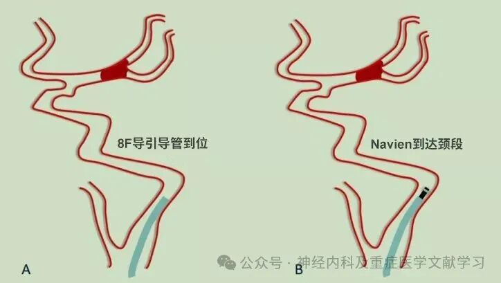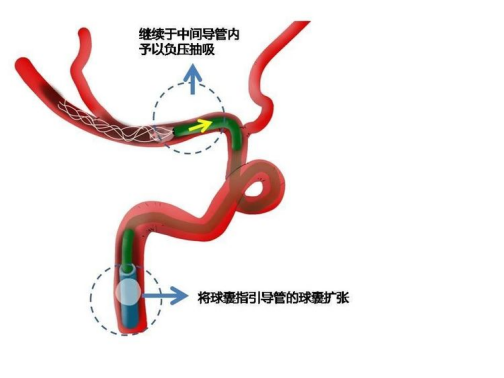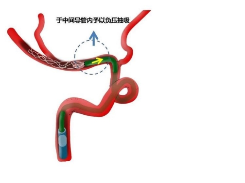 中间导管抽吸下裸奔到M1起始或眼动脉以下。减轻血栓负荷和通路建立。