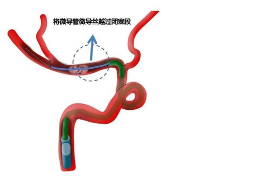 沿支架导丝交换中间导管接近血栓,这样最大限度预留管腔空间,便于抽吸血栓。