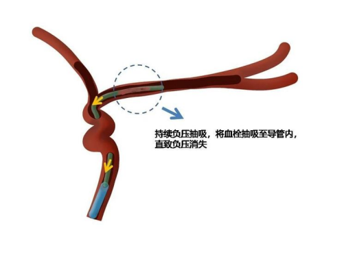 c、在前推抽吸导管的同时,使用针筒连接抽吸导管抽吸,遇到负压时保持负压,同时将抽吸泵连接到指引导管上,这样完成抽拉结合的取栓。