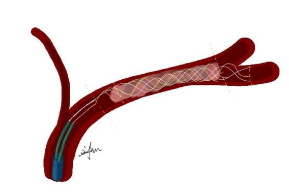 裸导丝支架技术:利用支架的铆定力量,缓慢撤出微导管于体外,只保留支架。