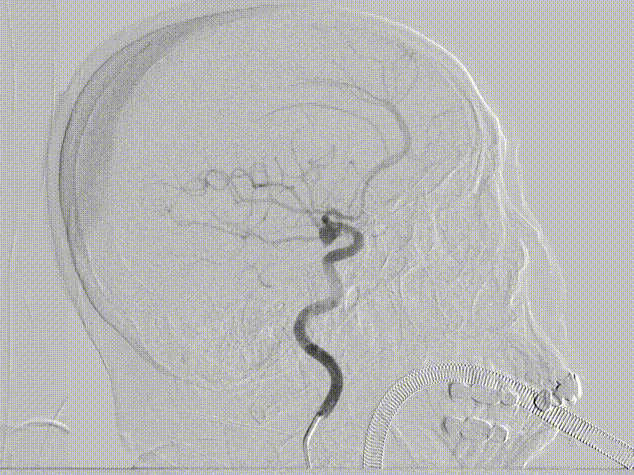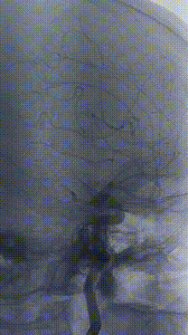 右侧颈动脉正侧位造影:可见原始胚胎型大脑后动脉。