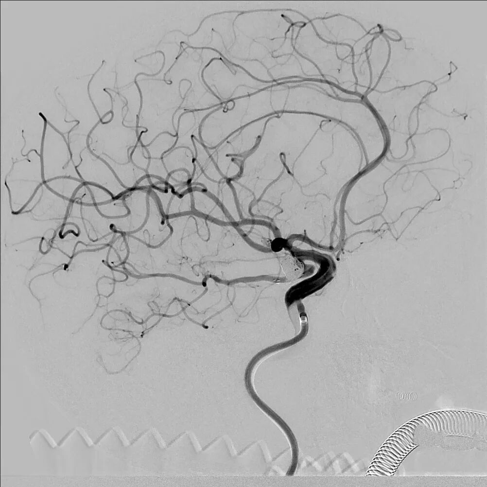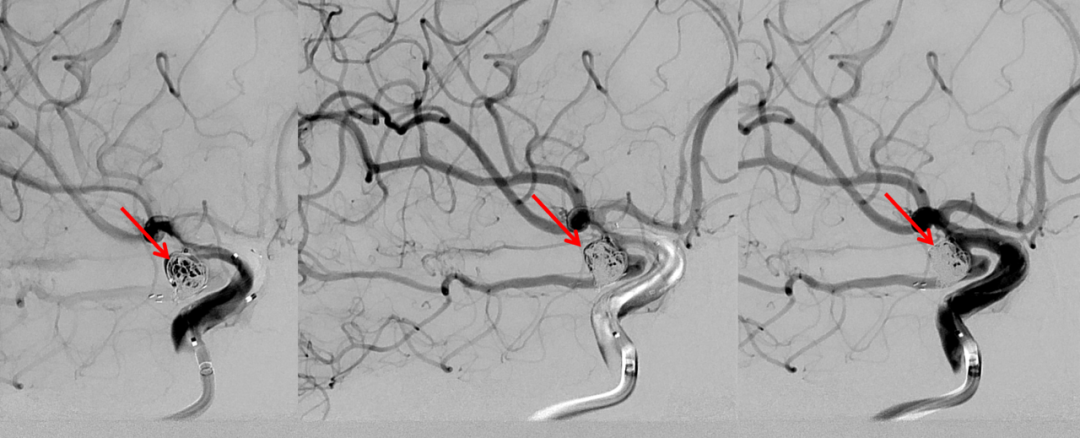 术后即刻造影:后交通动脉瘤致密栓塞,后交通动脉及颈内动脉保护良好。