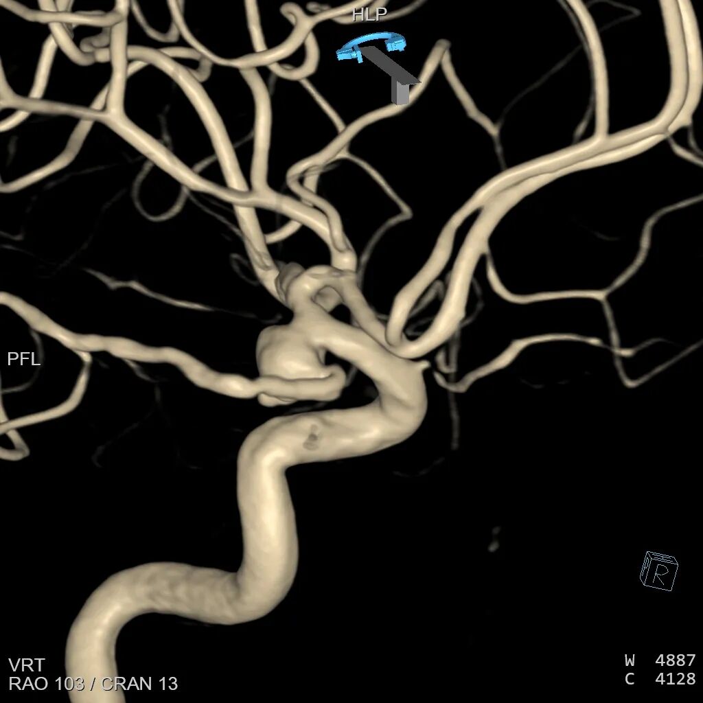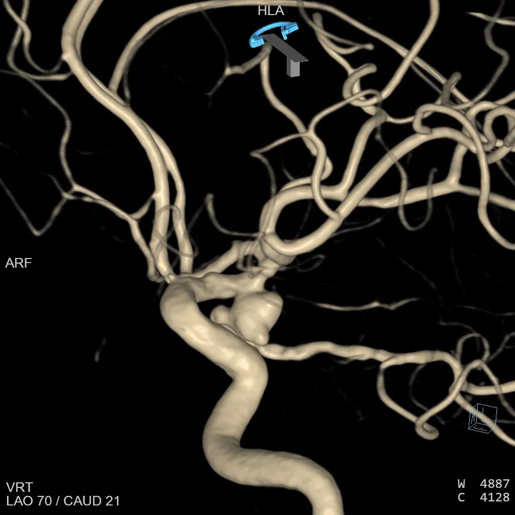 3D血管造影,选择合适的工作角度:分析载瘤动脉与动脉瘤之间的关系,动脉瘤完全由后交通动脉发出,且后交通动脉从颈内动脉处折返发出,微导丝超选进入后交通动脉角度刁钻,再次向患者家属交代病情,建议开颅夹闭,患者家属理解介入手术困难,仍要求介入治疗。