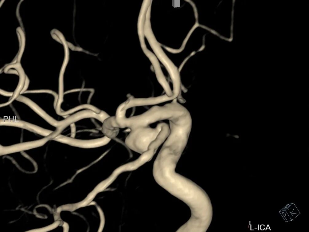 左侧颈内动脉3D造影可见动脉瘤位于后交通动脉起始处。