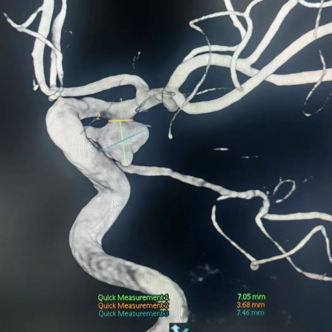 3D血管造影可见左侧后交通动脉瘤,大小约7.05×7.47mm,瘤颈3.68mm,考虑胚胎型大脑后动脉。