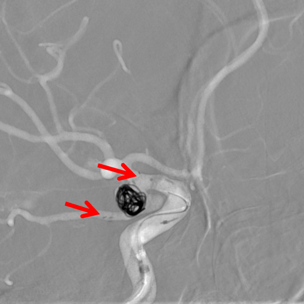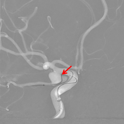 左侧颈动脉正侧位造影:左侧颈内动脉后交通段动脉瘤(箭头所示)。