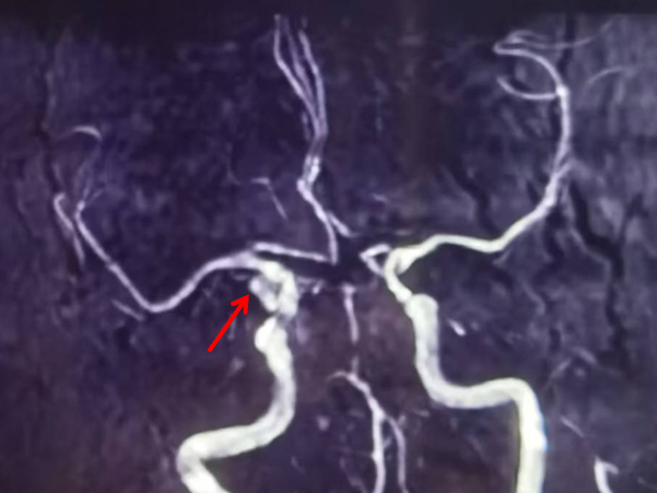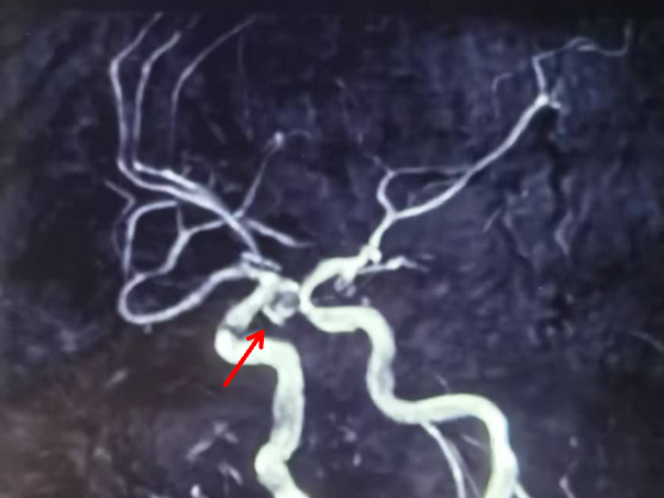 颅脑MRA(当地医院):左侧颈内动脉后交通段局部膨大,可疑动脉瘤。