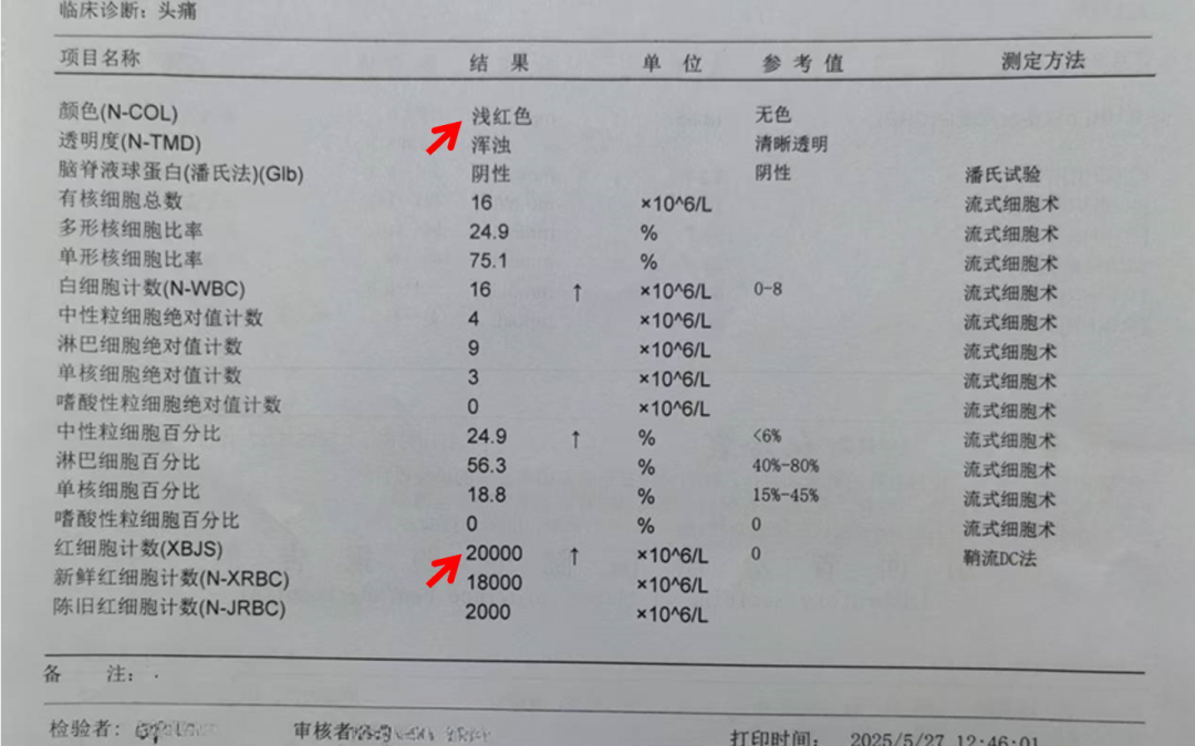 腰穿化验(当地医院):淡血性脑脊液。
