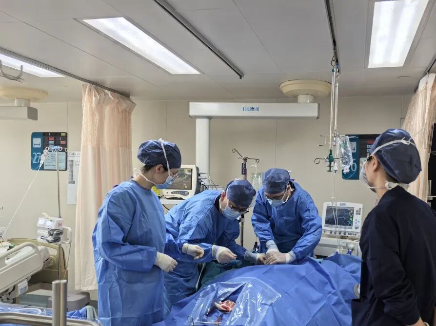 肝胆胰中心张军、曹刚团队紧急实施手术以控源止血,胃肠外科马向东、血管外科杨继武团队同步手术会诊协助抢救。术中探查发现患者腹腔损伤严重,多脏器受累且腹膜后存在广泛血肿:肝胆胰中心为其实施全脾切除术+胰尾修补术,血管外科团队完成胃小弯侧系膜修补术。整场手术出血量高达8000毫升,经过数个小时的鏖战,凌晨五点左右,手术顺利结束。