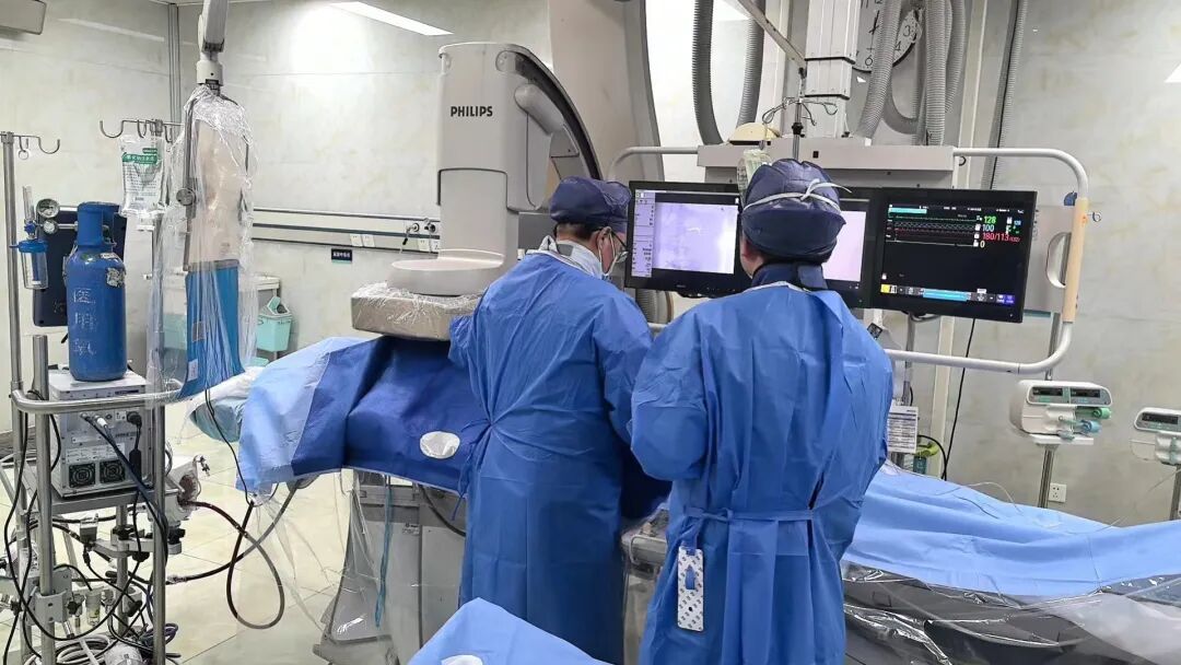 图为:介入科李浩团队在ECMO支持下为患者实施肾动脉栓塞术。