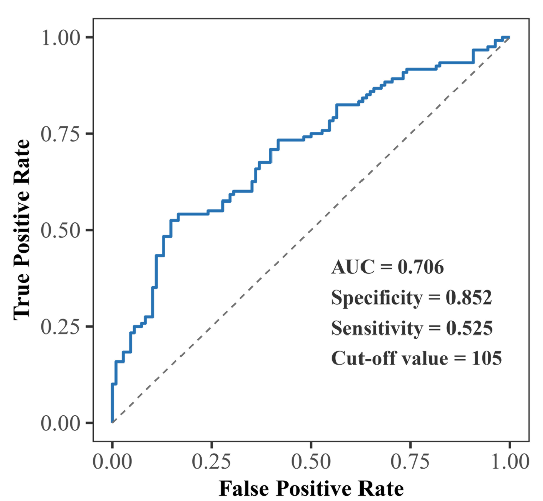 RCS分析显示IVG与90天mRS之间存在线性关系(非线性p=0.26)(图2)。ROC曲线分析确定了105 mL(曲线下面积=0.71,特异性=0.85,敏感性=0.53)作为预测90天良好预后(mRS≤3分)的最佳IVG截断值(图3)。基于该阈值,将患者分为两组:轻度IVG组(n=150)和重度IVG组(n=78)。