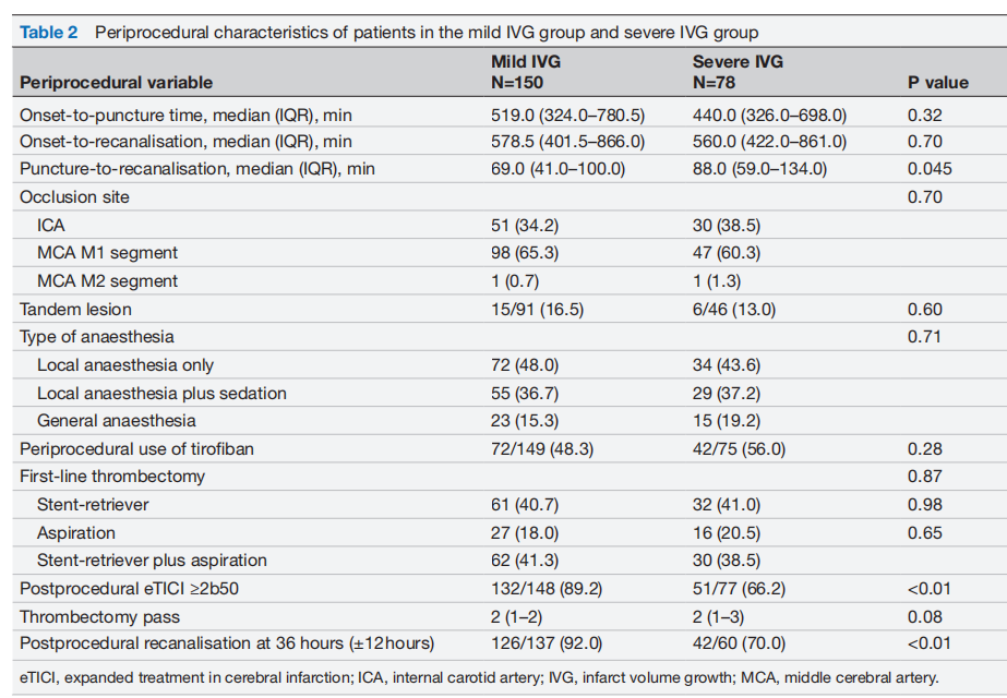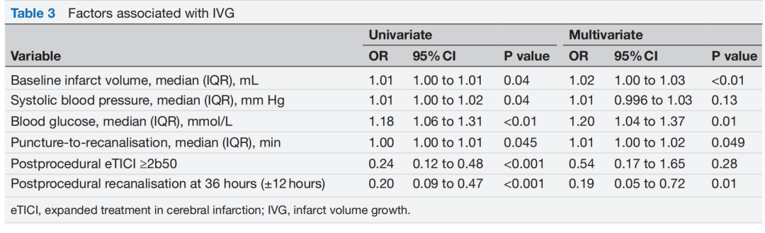 在本研究中,我们发现末次血管造影再通评分(eTICI≥2b50)与IVG无关联。我们推测这可能归因于MT术后早期再闭塞,这可能降低MT限制IVG的有效性。Marto等报道,成功MT后24小时内再闭塞可高达6.6%,其他研究观察到的发生率可达9.7%。