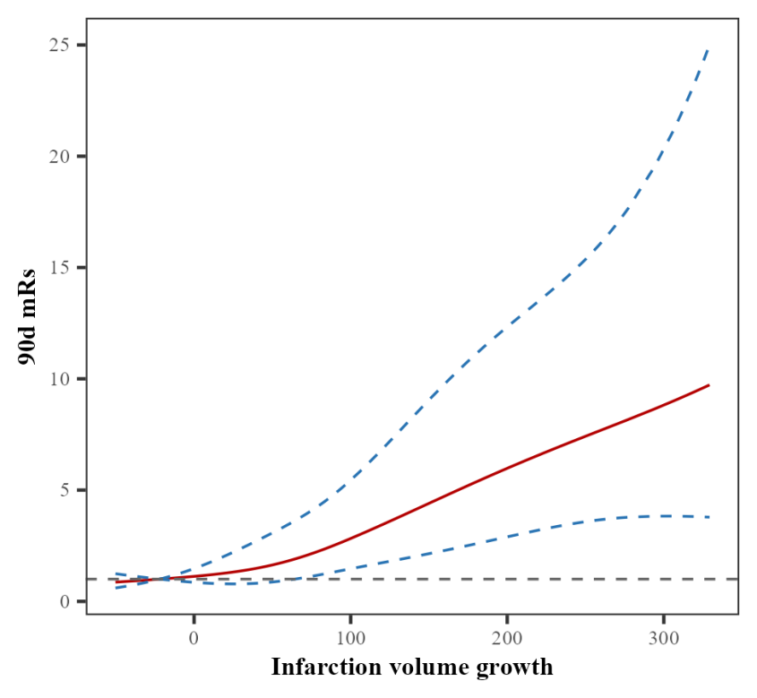 值得注意的是,在本大核心梗死患者队列中确定了105mL作为显著梗死增长的阈值。该阈值定义了MT术后影像学进展的程度。对体积阈值的解读必须考虑梗死体积与临床结局之间相互依赖的关系。在早期时间窗取栓试验的汇总分析中,梗死体积每减少10mL,功能独立(mRS 0-2分)的概率约增加5%。然而,在晚期时间窗试验中,随访梗死体积仅介导了治疗对临床结局约5.9%的获益,表明其在晚期卒中表现中作为替代终点的作用更为有限。这些发现共同表明,绝对的梗死体积阈值并非普遍适用的临床基准,而是取决于特定人群和病理生理状态。因此,105mL的截断值应被视为本研究中特定的、操作性的重大梗死扩大定义,作为本队列内的分层工具,而非独立的预后标志物。该发现还凸显了在该人群中应用多模态预测因子评估结果的潜在效用。