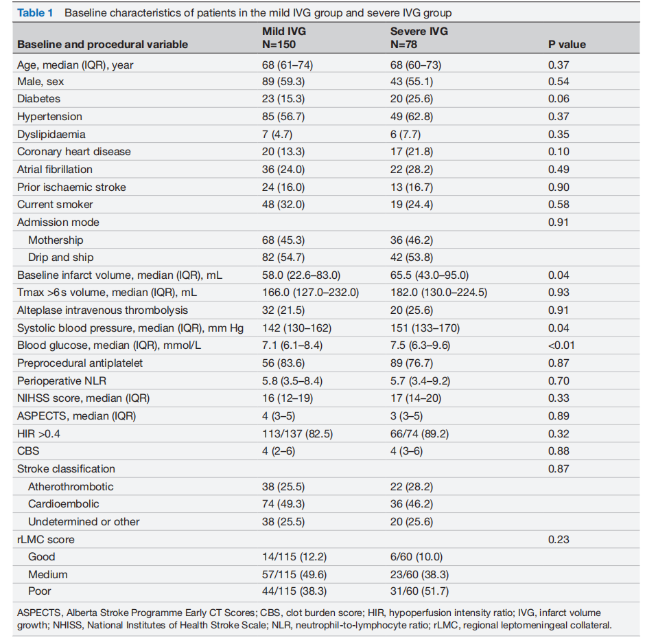 据我们所知,尚无研究探讨LVO所致大缺血核心梗死患者MT术后可调控的IVG决定因素。本研究旨在识别该患者群体中可调控的IVG危险因素,以帮助制定针对性策略改善患者预后。