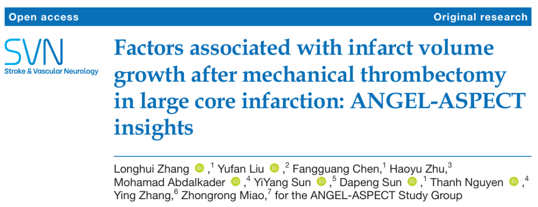 Zhang L, Liu Y, Chen F, Zhu H, Abdalkader M, Sun Y, Sun D, Nguyen T, Zhang Y, Miao Z, ANGEL-ASPECT Study Group. Factors associated with infarct volume growth after mechanical thrombectomy in large core infarction: ANGEL-ASPECT insights. Stroke Vasc Neurol 2026:svn-2025-004774. Doi: 10.1136/svn-2025-004774.